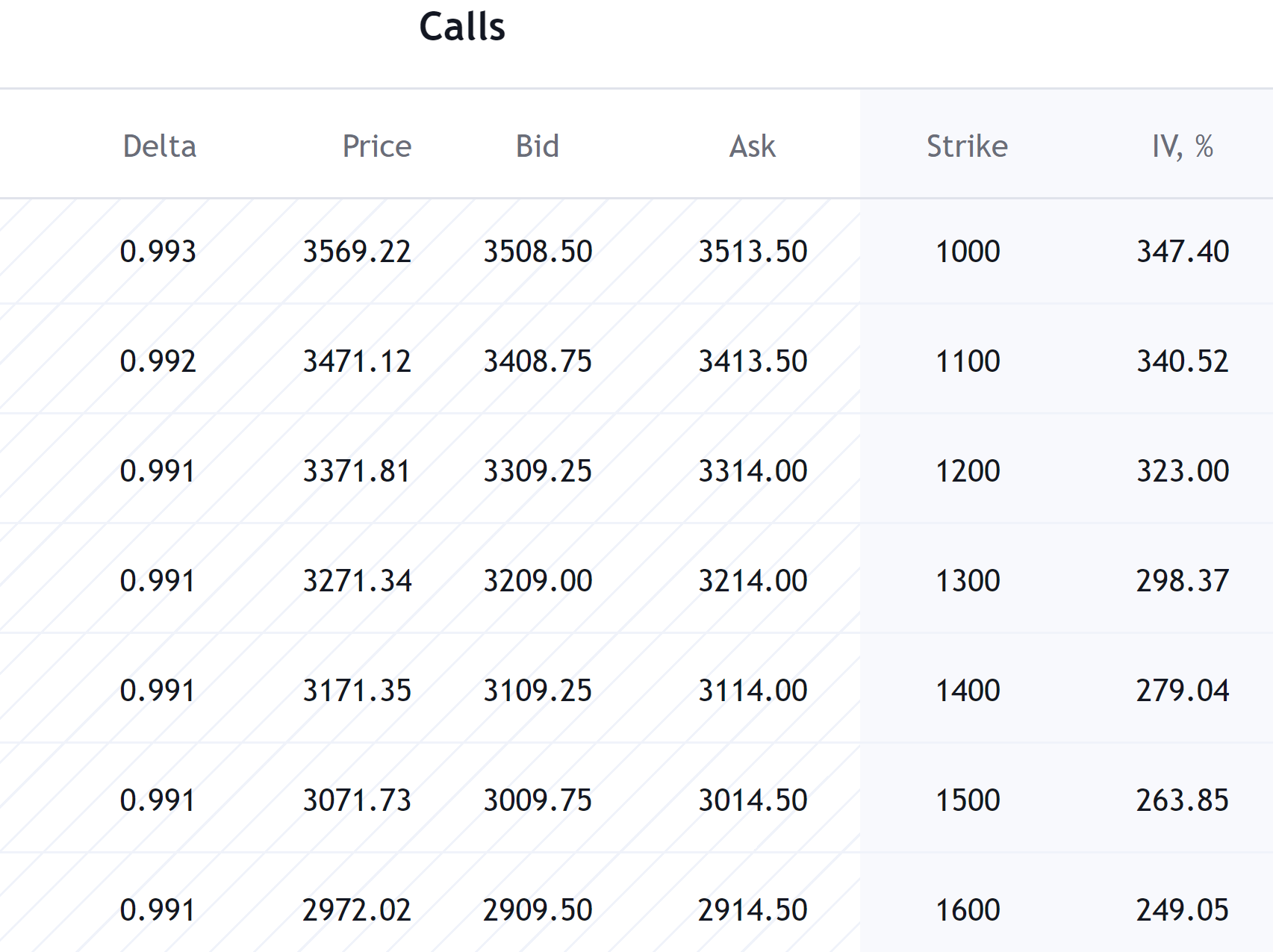 Mặt khác, các quyền chọn mua thua lỗ, trong đó giá thực hiện cao hơn giá hiện tại của tài sản cơ bản, thường có giá trị delta gần bằng 0. (xem bên dưới)
