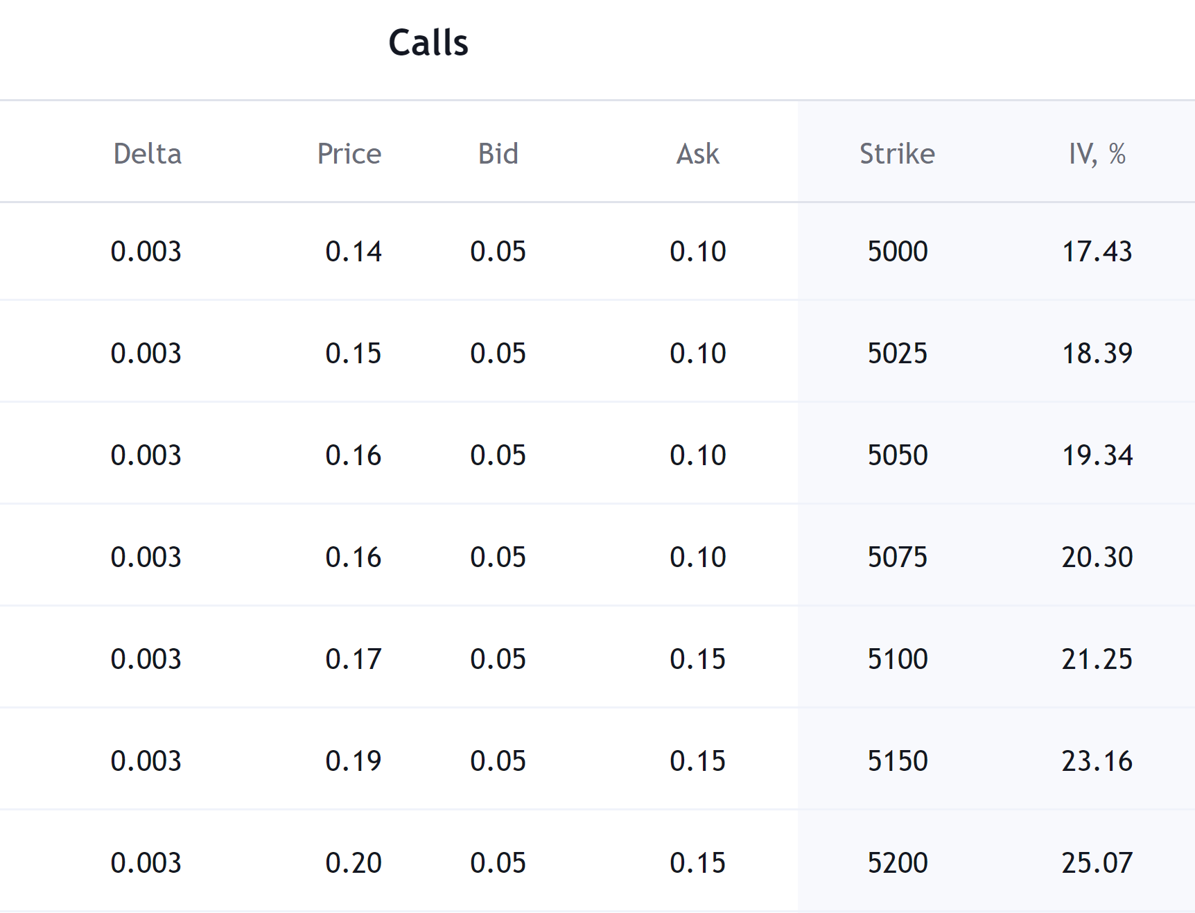 Và ngược lại, nếu giá của tài sản cơ sở giảm mạnh, chẳng hạn như xuống 4000, thì giá trị delta của quyền chọn sẽ giảm và tiến về 0, tức là biến động giá của tài sản cơ sở sẽ không ảnh hưởng đến giá của quyền chọn. (xem bên dưới)