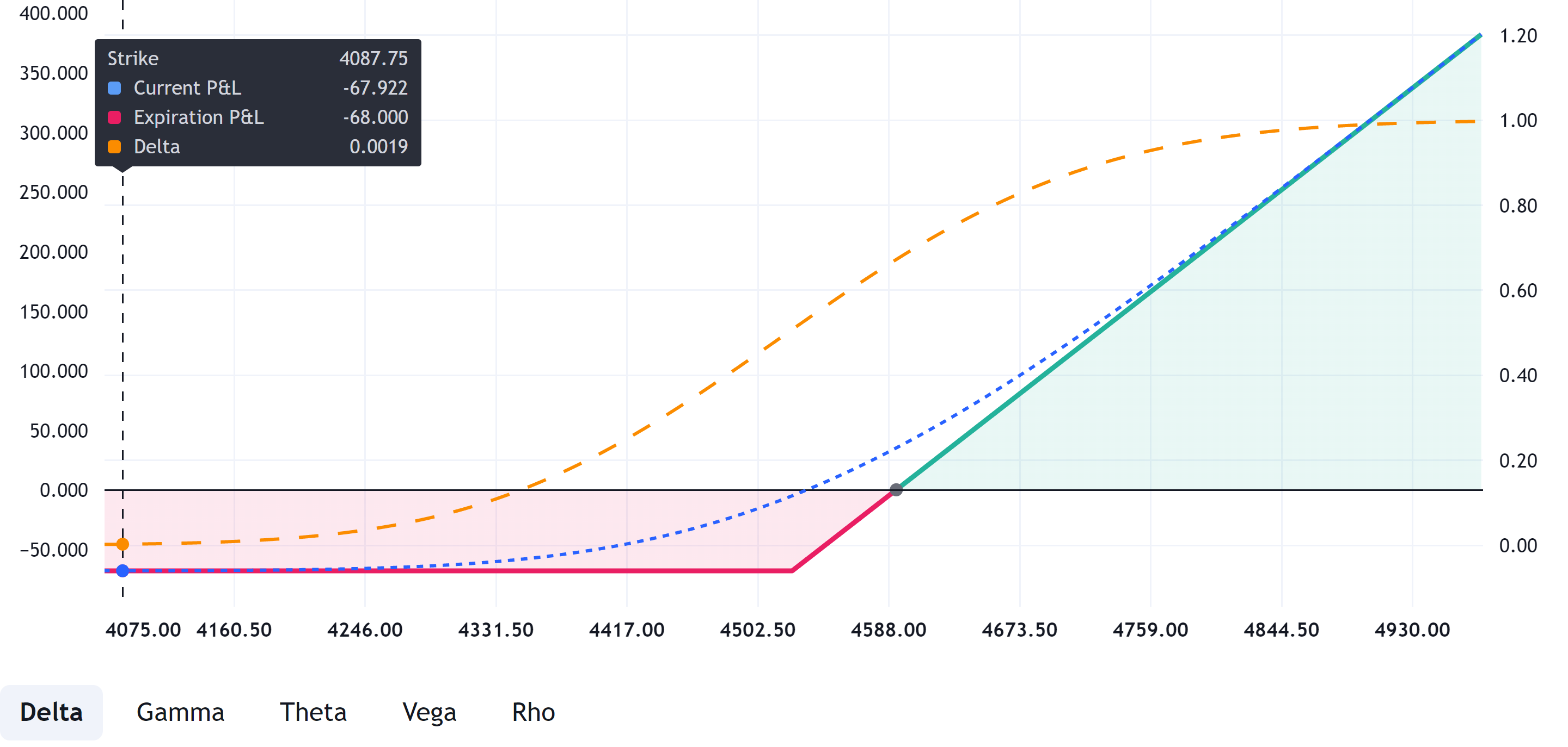 Khi giá của tài sản cơ bản thay đổi, giá trị delta của tùy chọn cũng thay đổi. Ví dụ: hãy thực hiện lại quyền chọn mua trên hợp đồng tương lai S&P 500 với mức thực hiện là 4600. Giả sử rằng giá hiện tại của tài sản cơ sở là 4610. Nếu giá của hợp đồng tương lai trên chỉ số S&P 500 tăng lên 5000, thì giá delta của quyền chọn của chúng ta sẽ tiến tới 1, điều đó có nghĩa là quyền chọn của chúng ta hiện đang có giá trị cao và biến động về giá của tài sản cơ sở được phản ánh trong giá của quyền chọn từ 1 đến 1. (xem bên dưới)