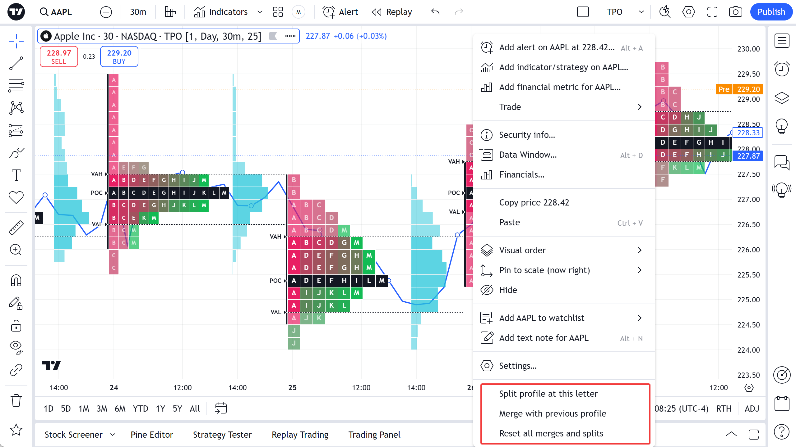 Biểu đồ và chỉ báo TPO hỗ trợ gộp hoặc tách hồ sơ.