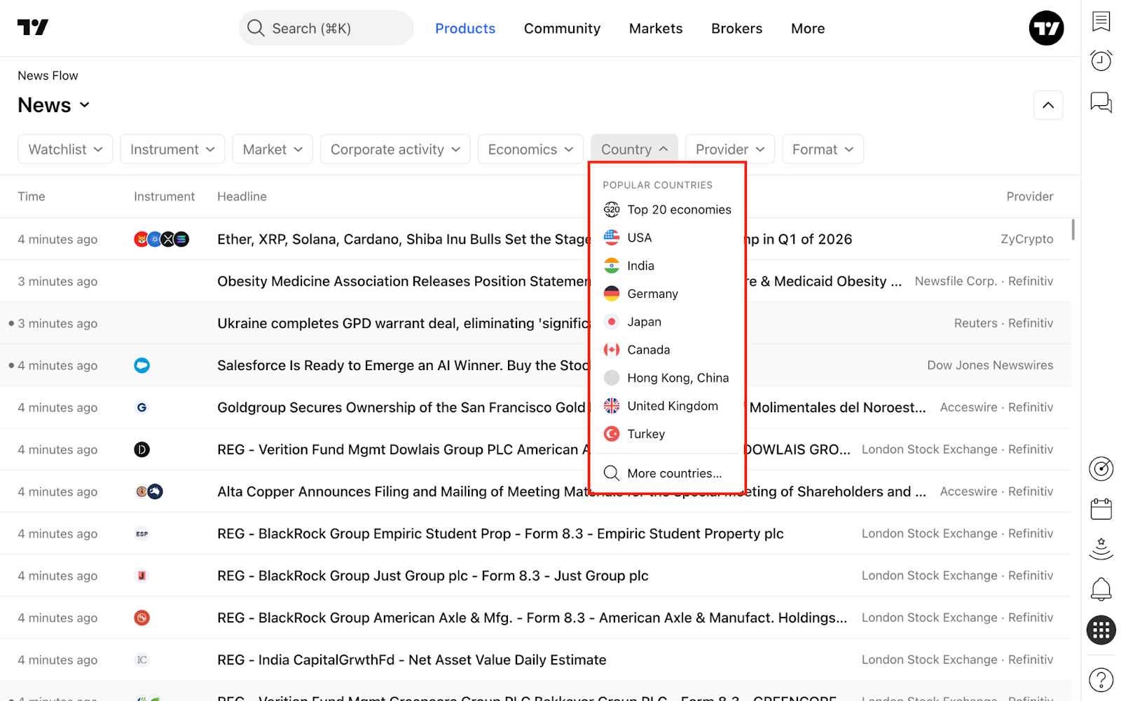 Bộ lọc bao gồm danh sách các quốc gia và nhóm quốc gia có sẵn tin tức. Bạn có thể chọn một hoặc nhiều giá trị trong bộ lọc này.
