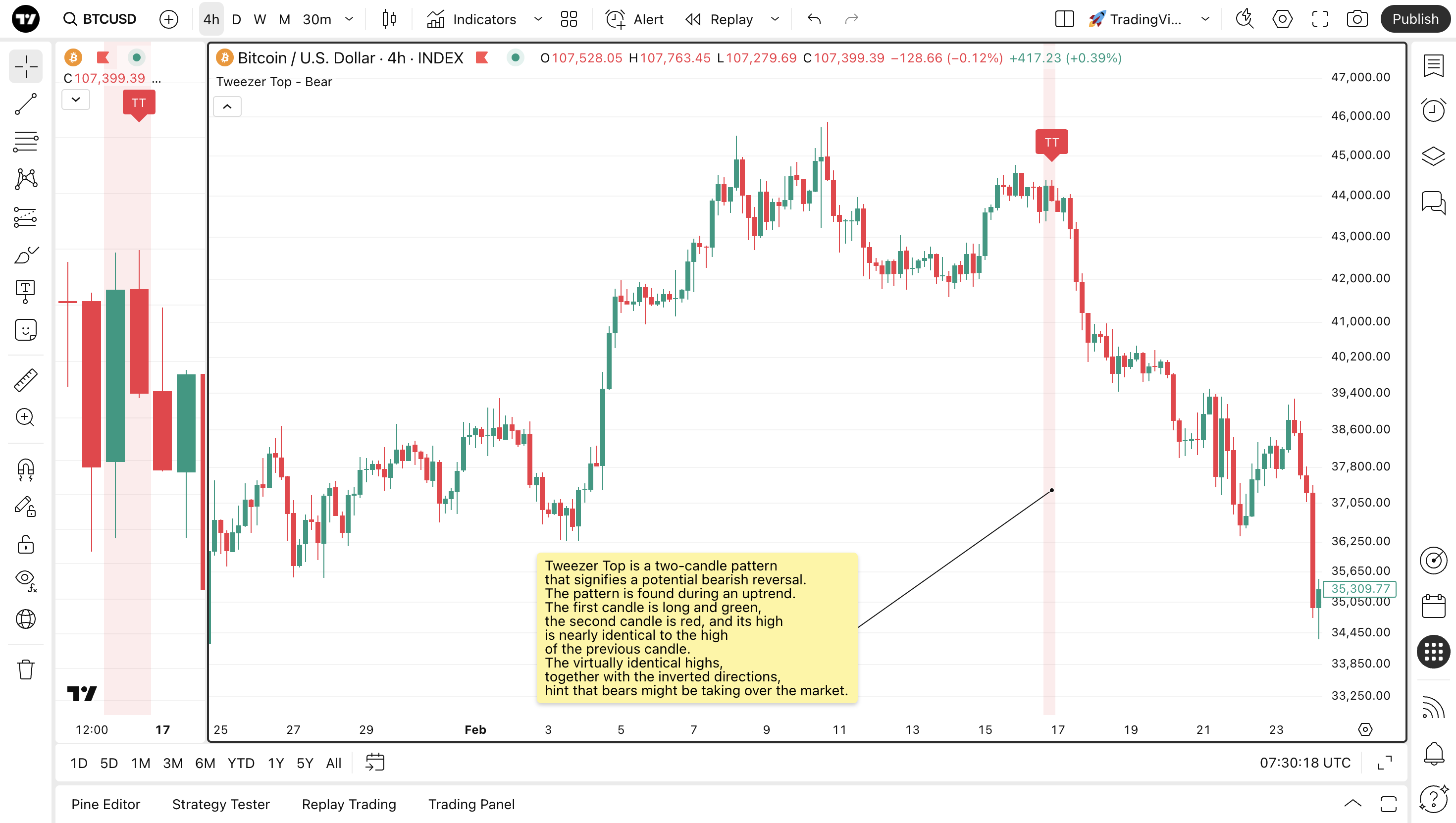 Một trong số đó là Tweezer Top — Bearish — một mô hình hai nến phải xuất hiện ở đỉnh của xu hướng. Đỉnh của nến thứ hai phải gần bằng đỉnh của nến thứ nhất, cho thấy phe mua không có khả năng đẩy giá lên cao hơn.