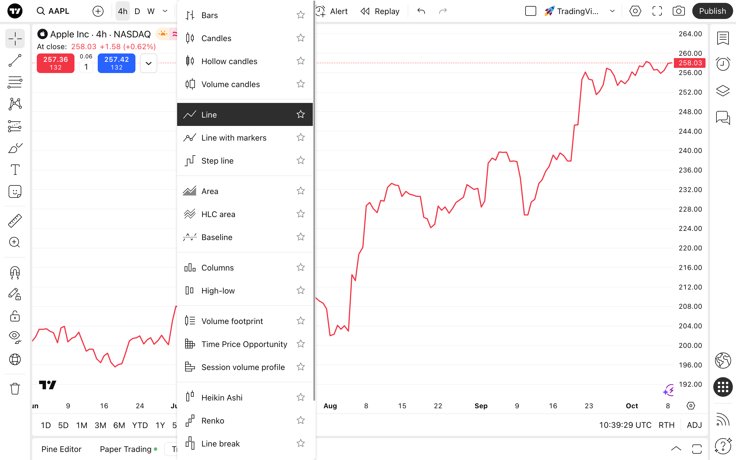 Tại đây, bạn có thể chọn từ hơn 20 kiểu biểu đồ phù hợp hơn với cách tiếp cận phân tích của mình. Từ các thanh cổ điển và nến cổ điển đến các tùy chọn phức tạp hơn như Renko charts — khám phá cách sử dụng từng loại trong cơ sở kiến thức của chúng tôi.