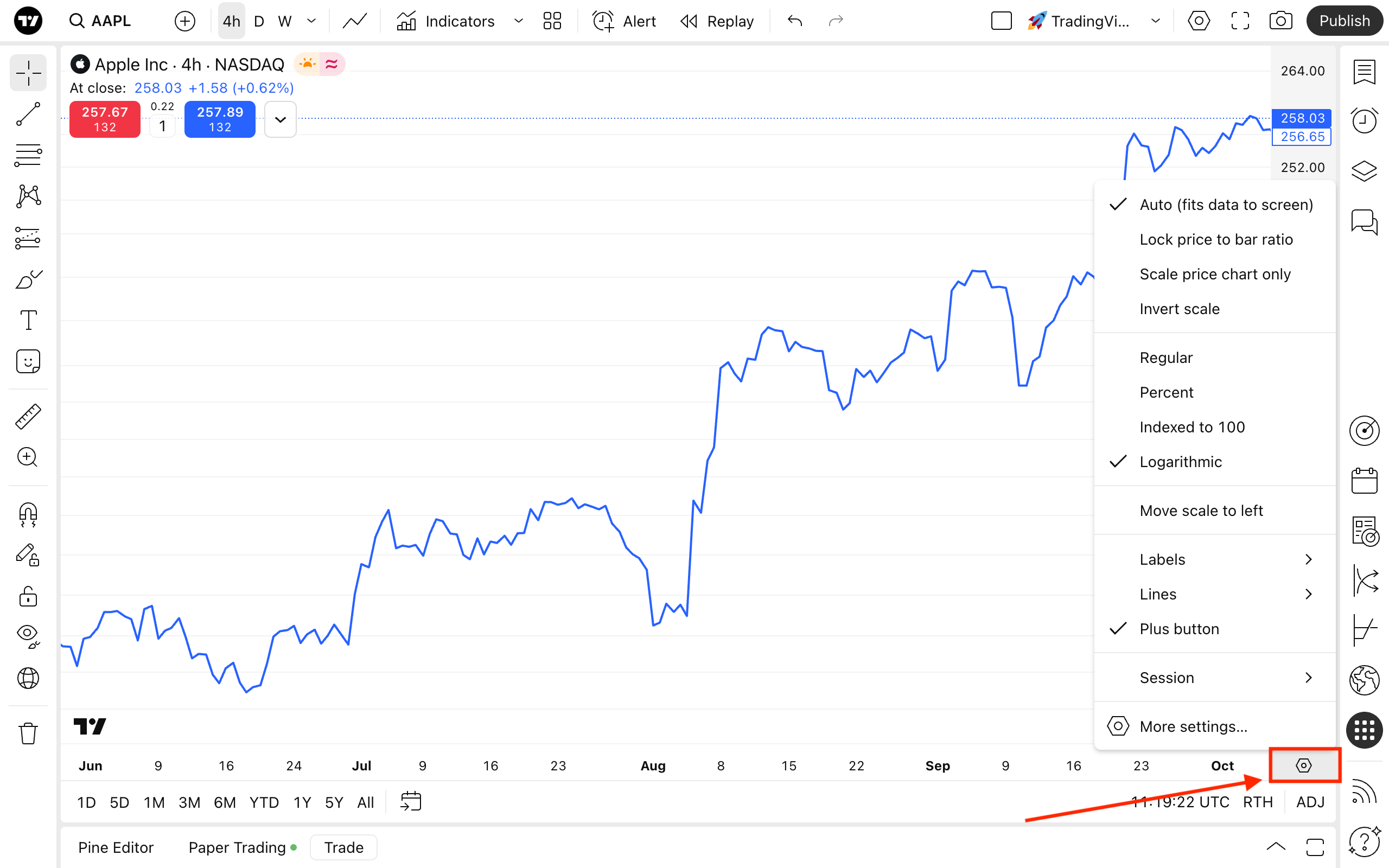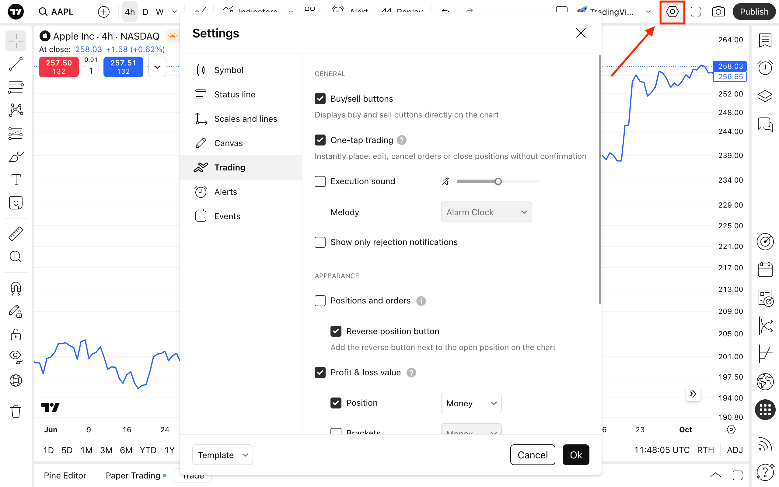 Bạn có thể cấu hình biểu đồ theo ý muốn. Để mở menu cài đặt, hãy nhấp vào nút Cài đặt ở góc trên bên phải hoặc nhấp đúp vào đường giá/thanh/nến.