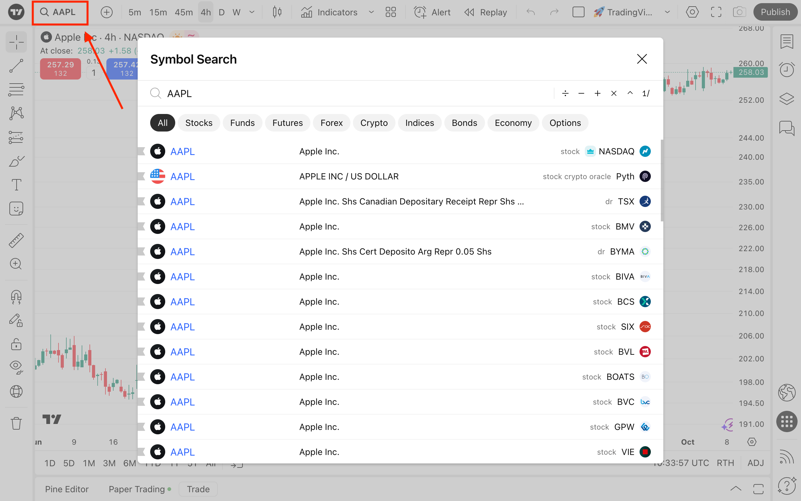 - Bắt đầu nhập mã giao dịch. Ví dụ, để mở biểu đồ cổ phiếu của Apple, hãy nhập "AAPL"