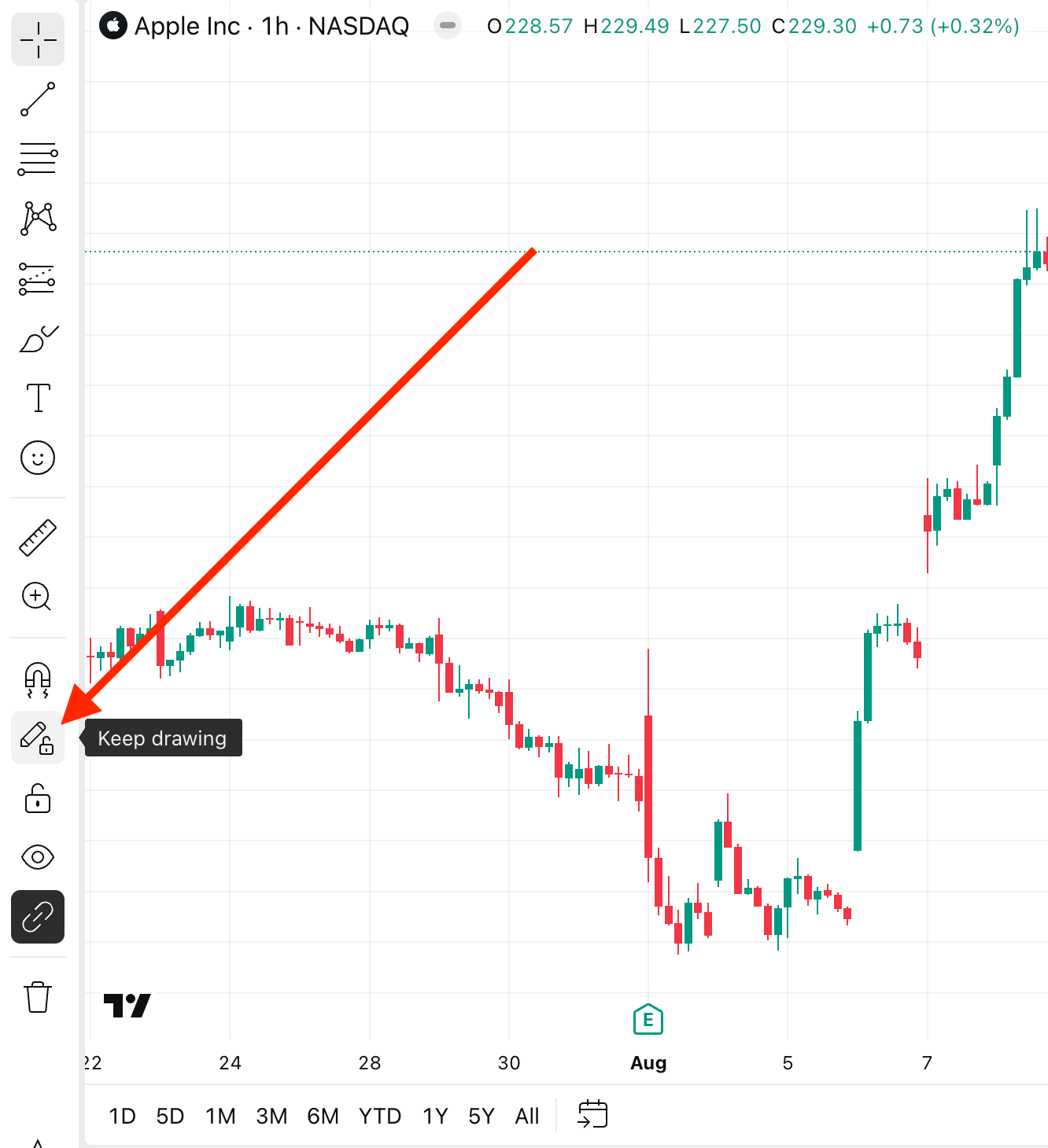 Nếu mỗi lần bạn nhấp vào biểu đồ lại xuất hiện thêm hình vẽ, rất có thể tùy chọn "Tiếp tục vẽ" đã được bật. Bạn có thể tắt tùy chọn này bằng cách nhấp vào biểu tượng bút chì ở bảng điều khiển bên trái.