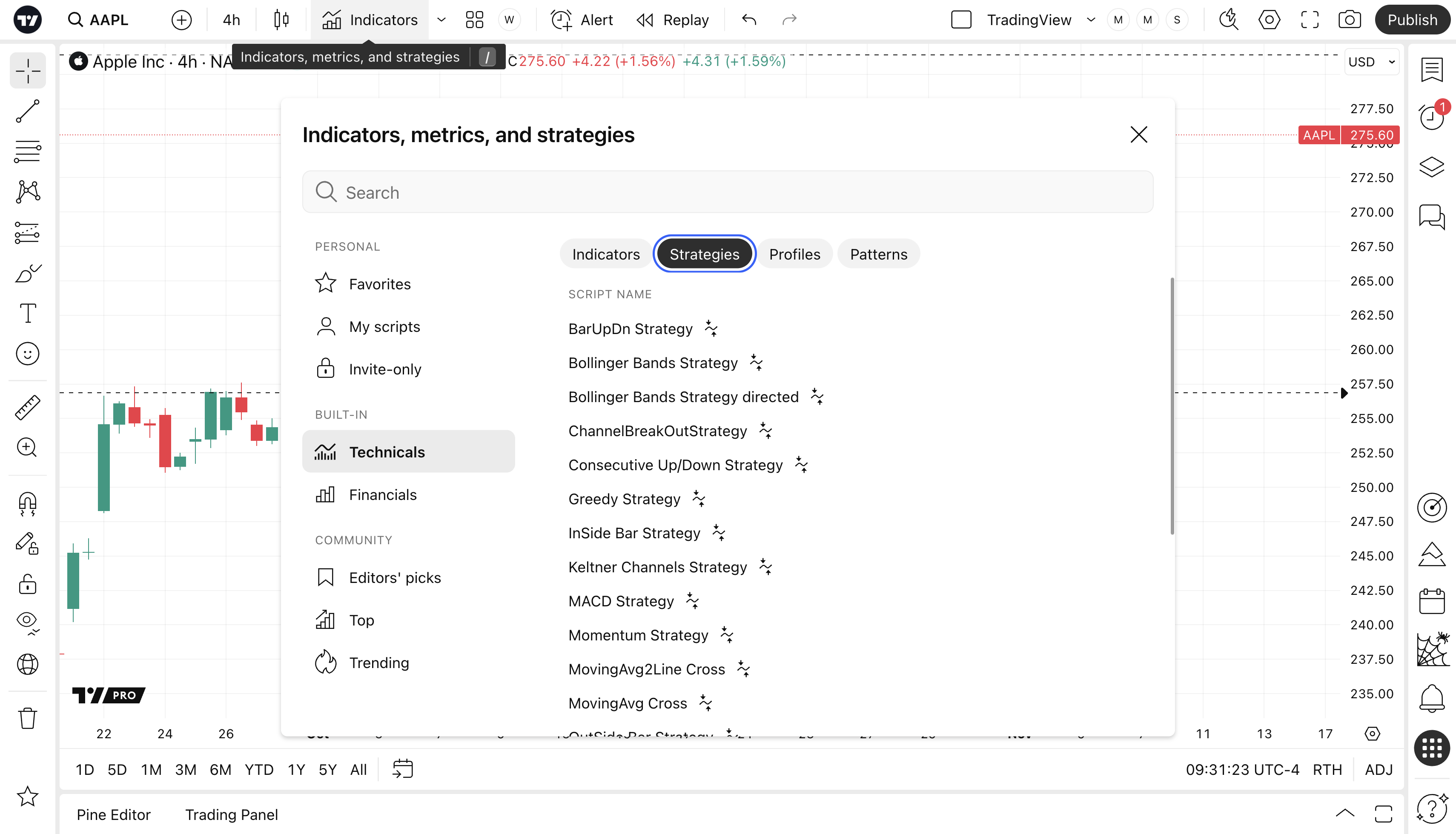 Để tạo cảnh báo cho một chiến lược, bạn cần chọn một chiến lược trong cửa sổ "Chỉ báo, số liệu và chiến lược". Tại đó, hãy mở tab "Kỹ thuật" và chọn "Chiến lược".