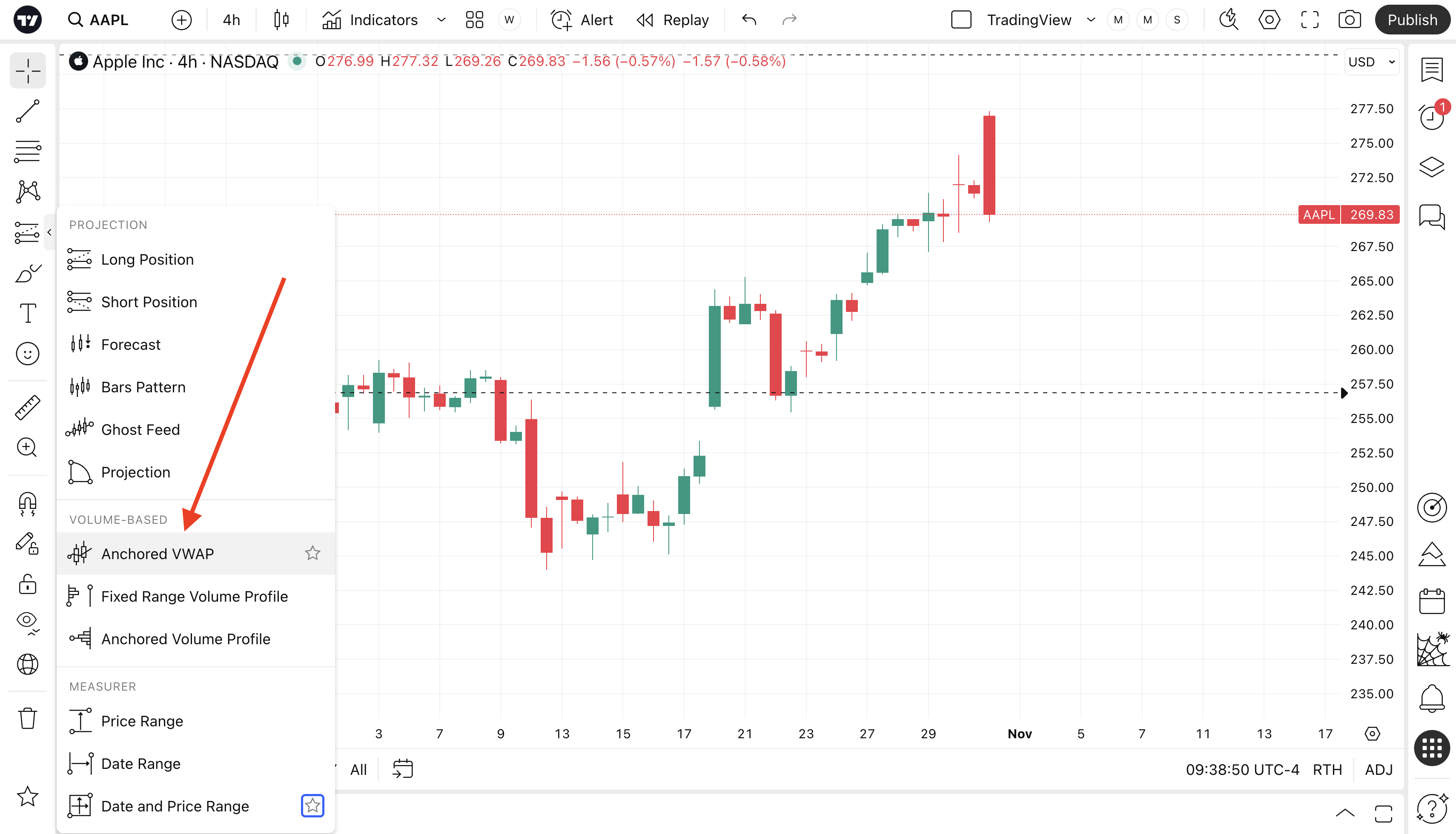 Bạn có thể tìm thấy Anchored VWAP trong "Công cụ dự báo và đo lường" trên thanh công cụ bên trái.