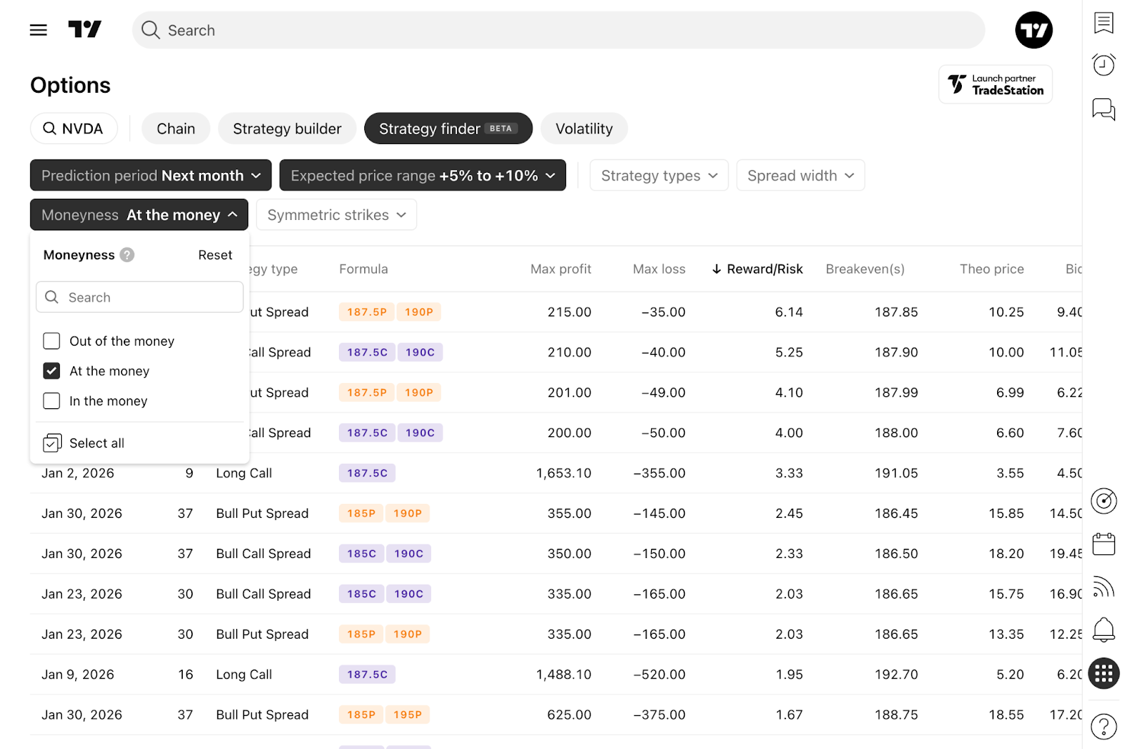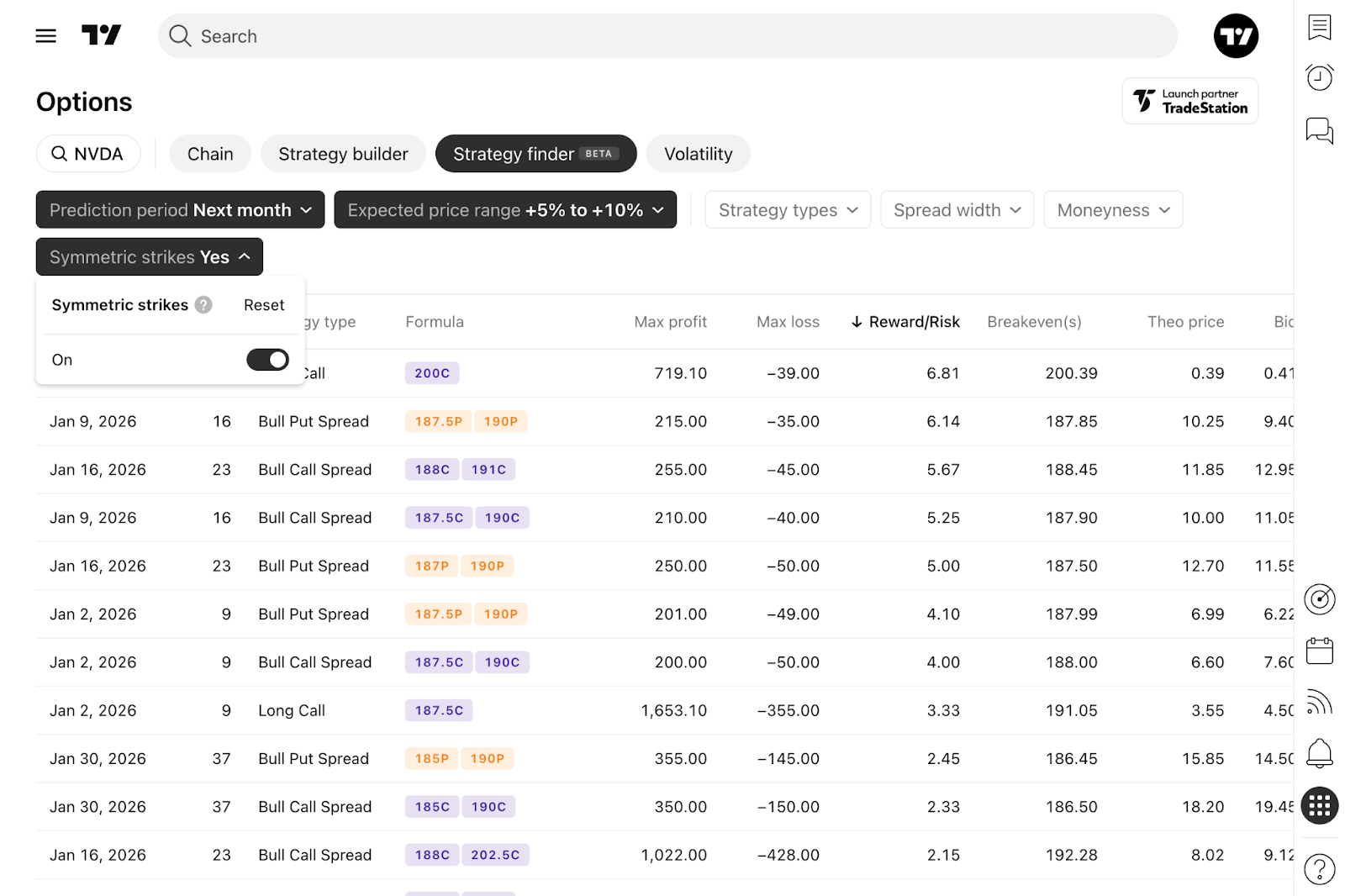Công cụ tìm chiến lược quyền chọn có thể liệt kê và xếp hạng các chiến lược chênh lệch phù hợp với kỳ vọng thị trường của bạn dựa trên tỷ lệ lợi nhuận so với rủi ro. Chỉ số này phản ánh lợi nhuận kỳ vọng so với mức rủi ro tối đa, trong đó rủi ro tối đa được ước tính dựa trên mức sụt giảm lịch sử trong khung thời gian giao dịch, với độ tin cậy 99% cho từng công cụ cụ thể.